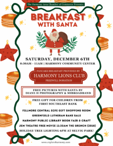 Enjoy a delicious breakfast served by the Harmony Lions Club, a Kids Gift Shopping Room hosted by ECFE, and photos with Santa by Diane H Photography. It’s a morning full of laughter, joy, and holiday magic for families of all ages.