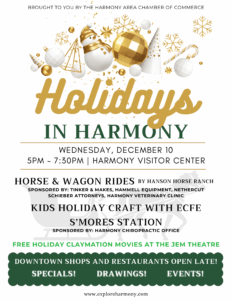 The holiday season is a magical time in Harmony, and our community is ready to celebrate with festive traditions, small-town cheer, and plenty of opportunities to shop local, make memories, and connect with neighbors and friends.